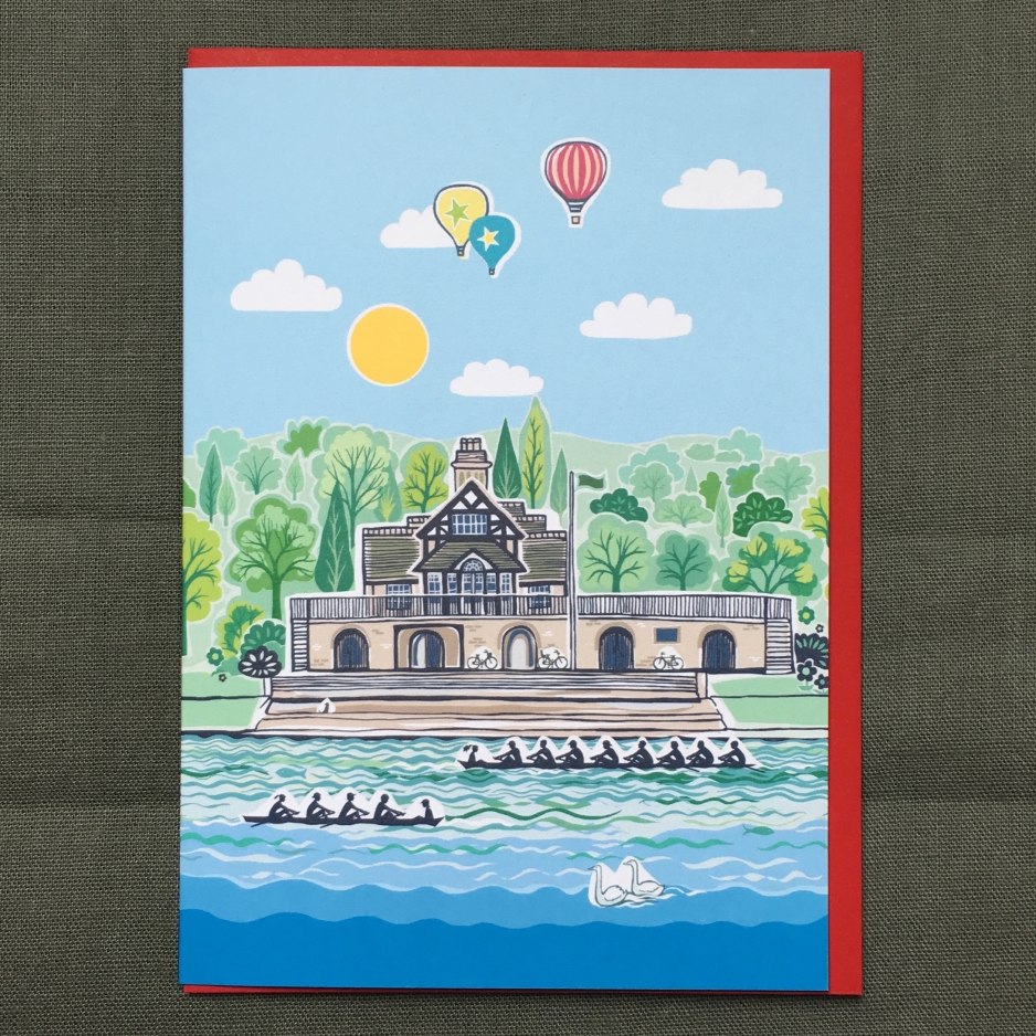 Folded card with illustration by Linda Edwards celebrating the River Severn loop in Shrewsbury.